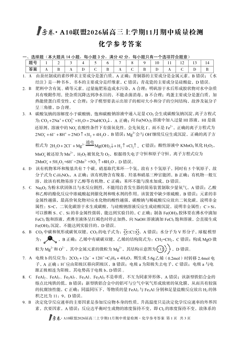 1号卷·A10联盟2026届高三上学期11月期中质量检测 化学答案.pdf