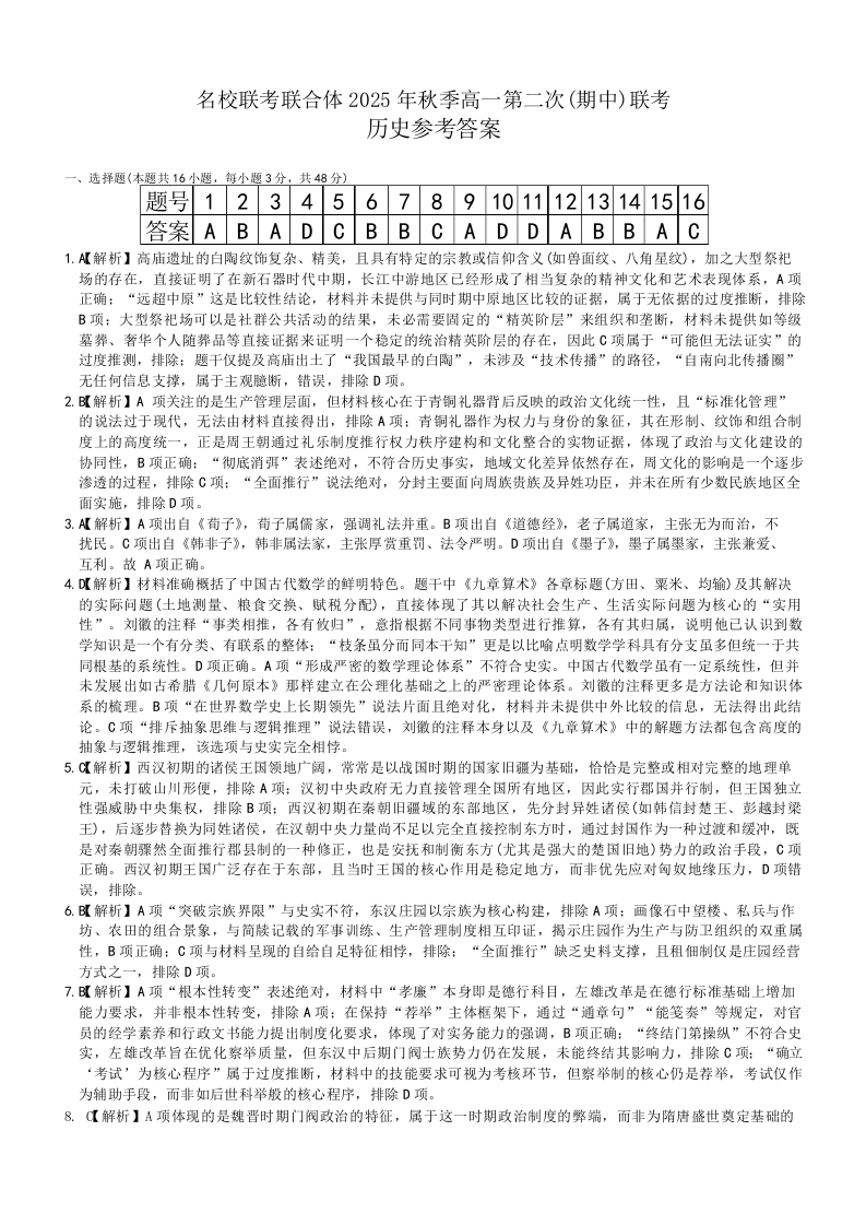 湖南炎德英才名校联考联合体2025年秋季高一第二次(期中)联考 历史答案.docx