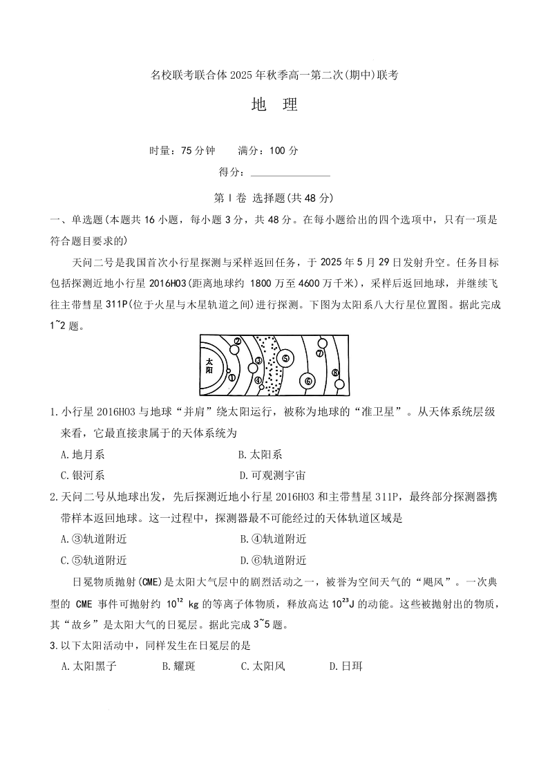 湖南炎德英才名校联考联合体2025年秋季高一第二次(期中)联考 地理.docx