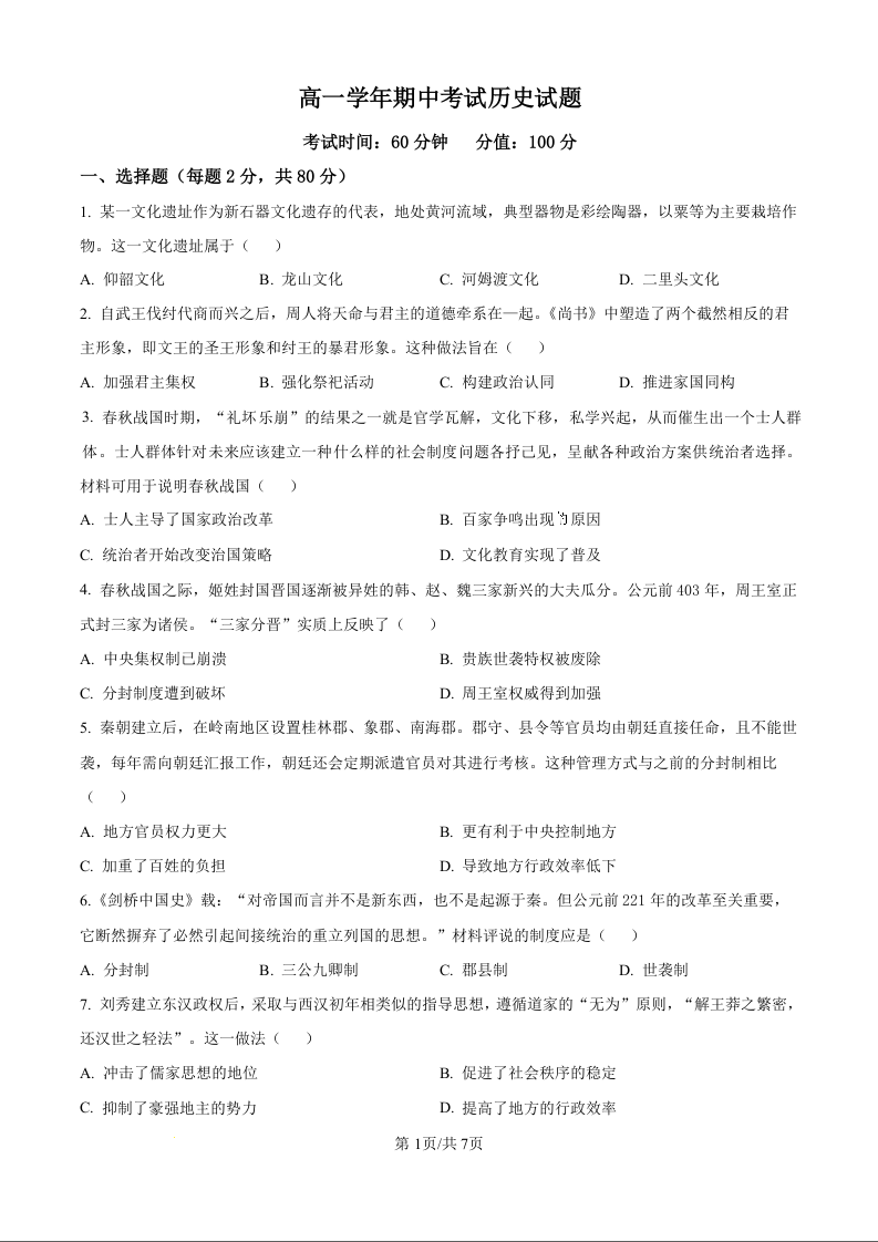 黑龙江省牡丹江市第一高级中学2025-2026学年高一上学期11月期中考试 历史.docx
