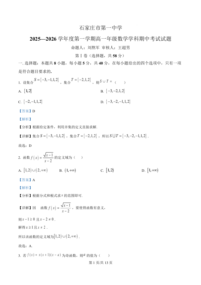 河北省石家庄市第一中学2025-2026学年高一上学期期中考试 数学答案.docx
