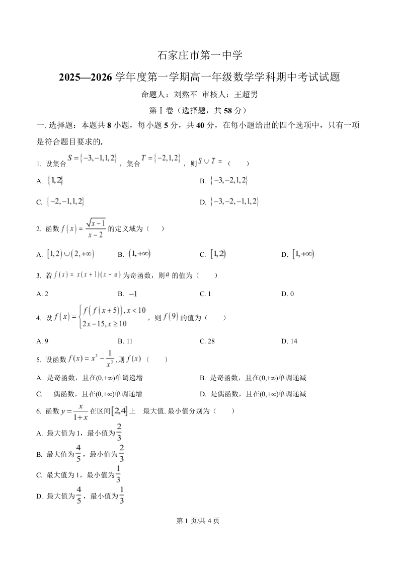 河北省石家庄市第一中学2025-2026学年高一上学期期中考试 数学.docx