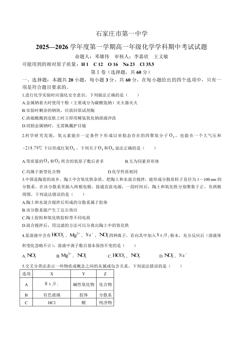 河北省石家庄市第一中学2025-2026学年高一上学期期中考试 化学试题(含答案).docx