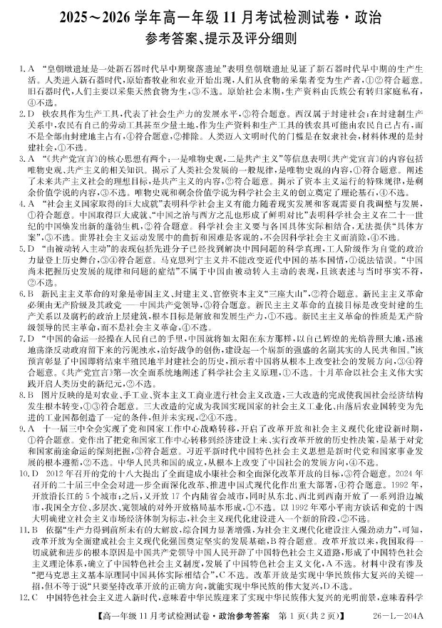 河北省保定市部分校2025-2026学年高一年级上学期期中考试 政治答案.pdf