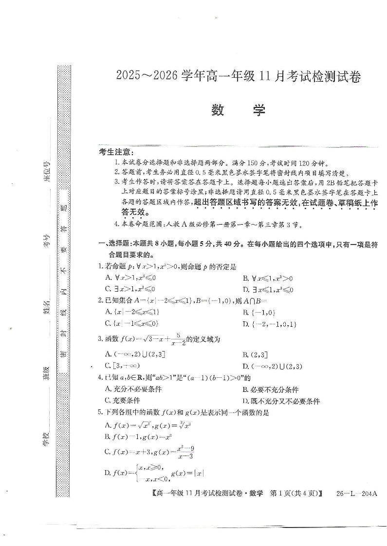 河北省保定市部分校2025-2026学年高一年级上学期期中考试 数学.pdf