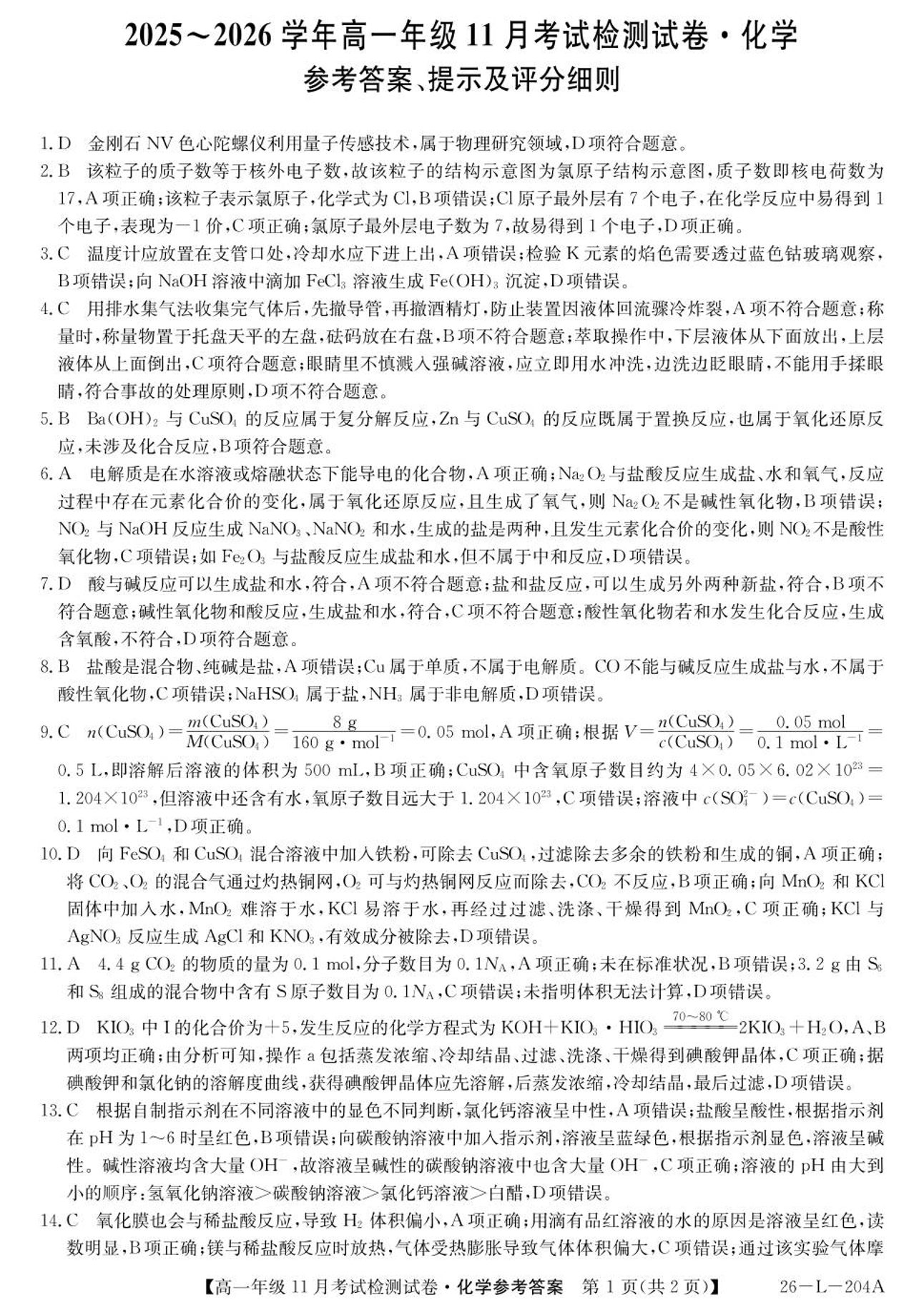 河北省保定市部分校2025-2026学年高一年级上学期期中考试 化学答案.pdf