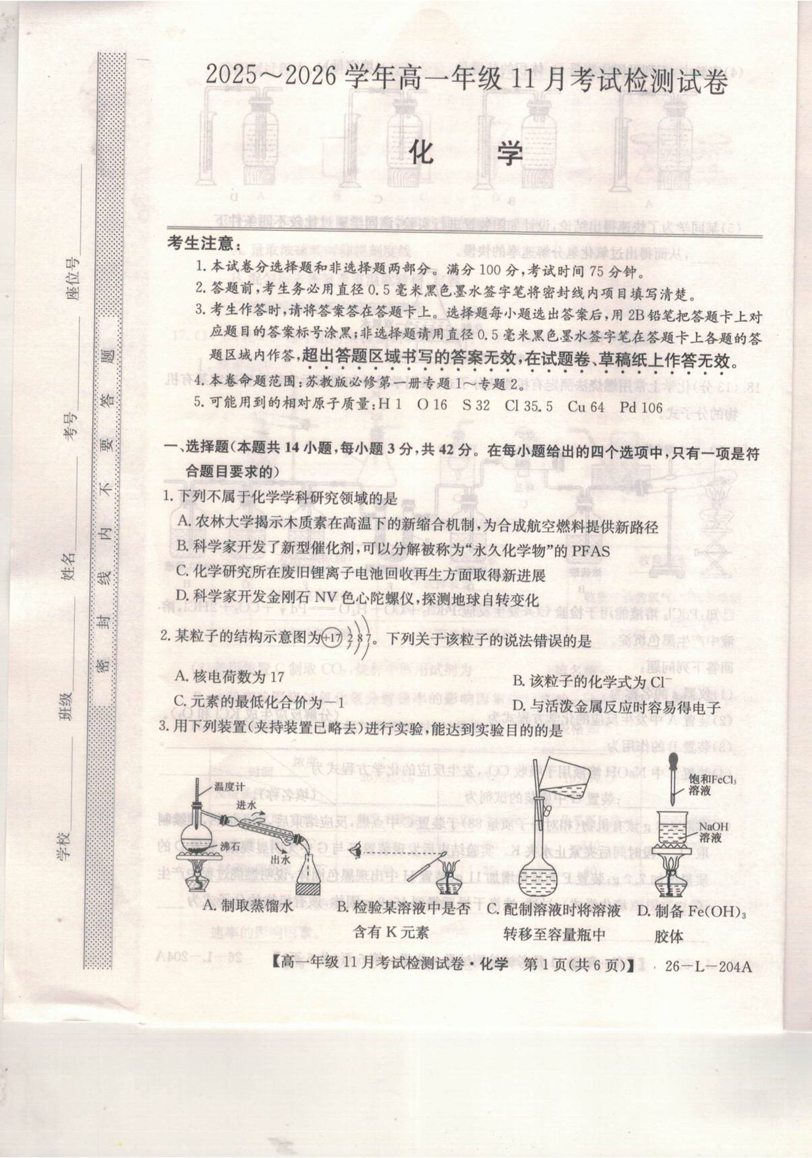 河北省保定市部分校2025-2026学年高一年级上学期期中考试 化学.pdf