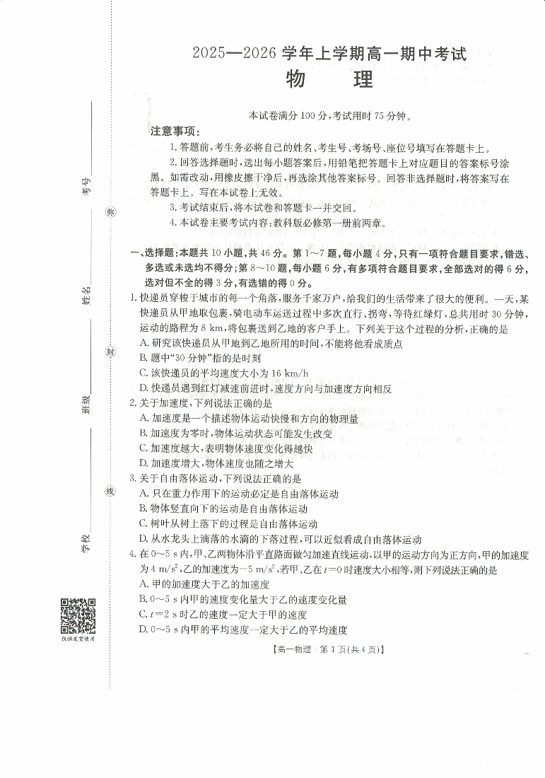 广西省2025-2026学年高一上学期11月期中考试 物理.pdf