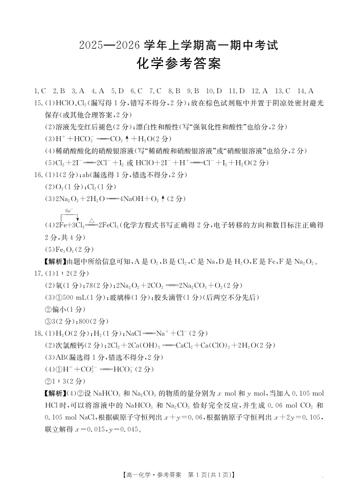 广西省2025-2026学年高一上学期11月期中考试 化学答案.pdf