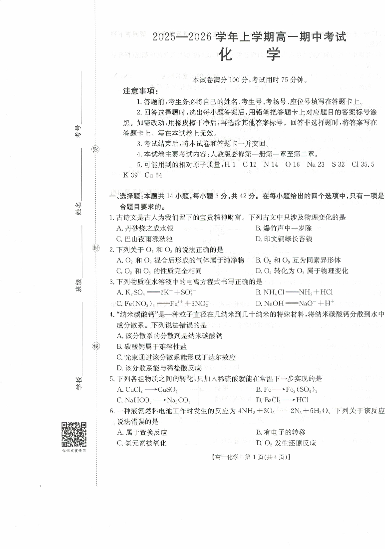 广西省2025-2026学年高一上学期11月期中考试 化学.pdf