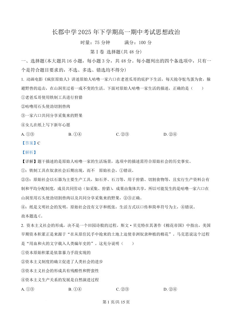 湖南省长沙市长郡中学2025-2026学年高一上学期期中考试 政治答案.docx