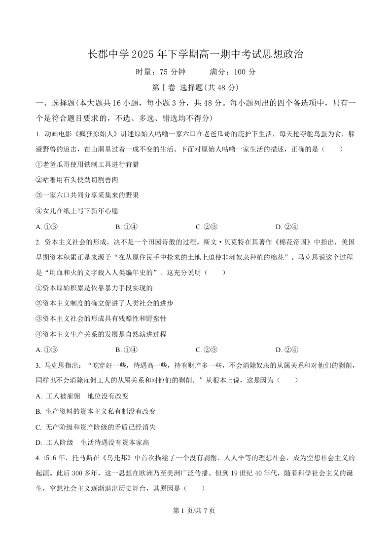 湖南省长沙市长郡中学2025-2026学年高一上学期期中考试 政治.docx