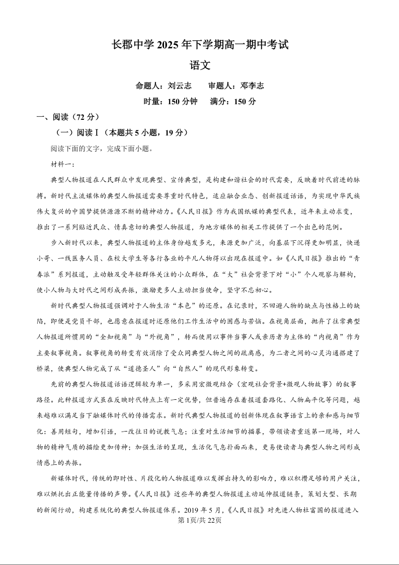 湖南省长沙市长郡中学2025-2026学年高一上学期期中考试 语文答案.docx