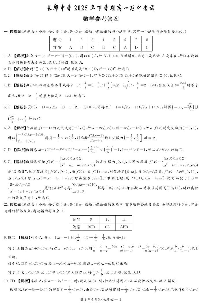 湖南省长沙市长郡中学2025-2026学年高一上学期期中考试 数学答案.pdf