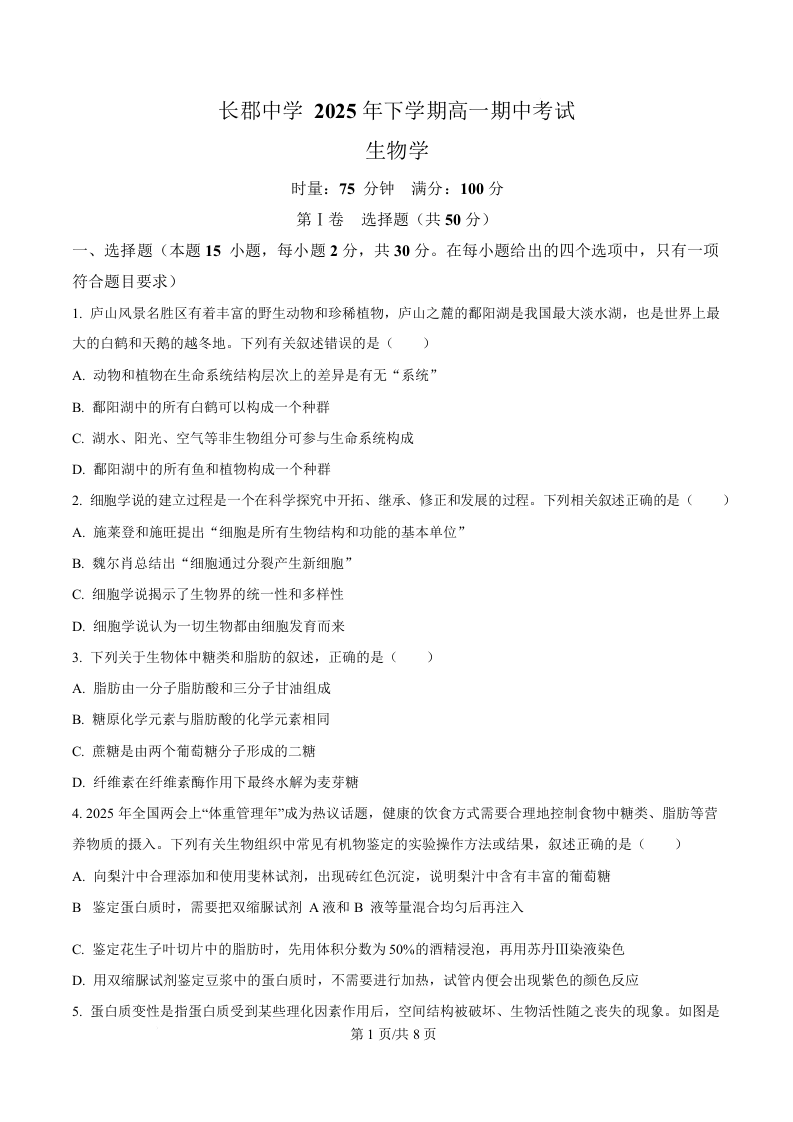湖南省长沙市长郡中学2025-2026学年高一上学期期中考试 生物.docx