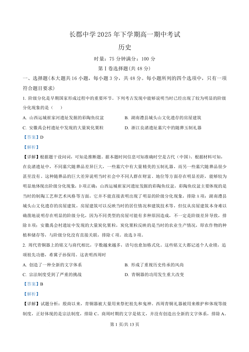 湖南省长沙市长郡中学2025-2026学年高一上学期期中考试 历史答案.docx