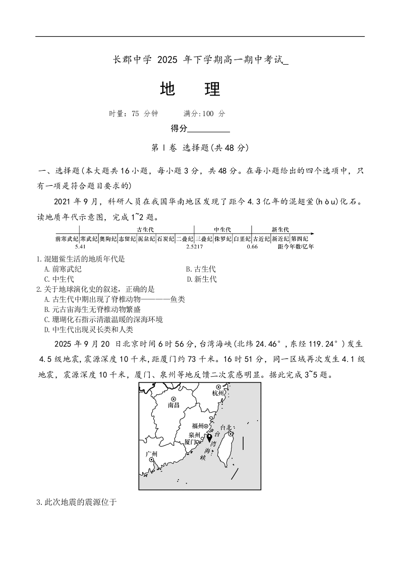 湖南省长沙市长郡中学2025-2026学年高一上学期期中考试 地理.docx