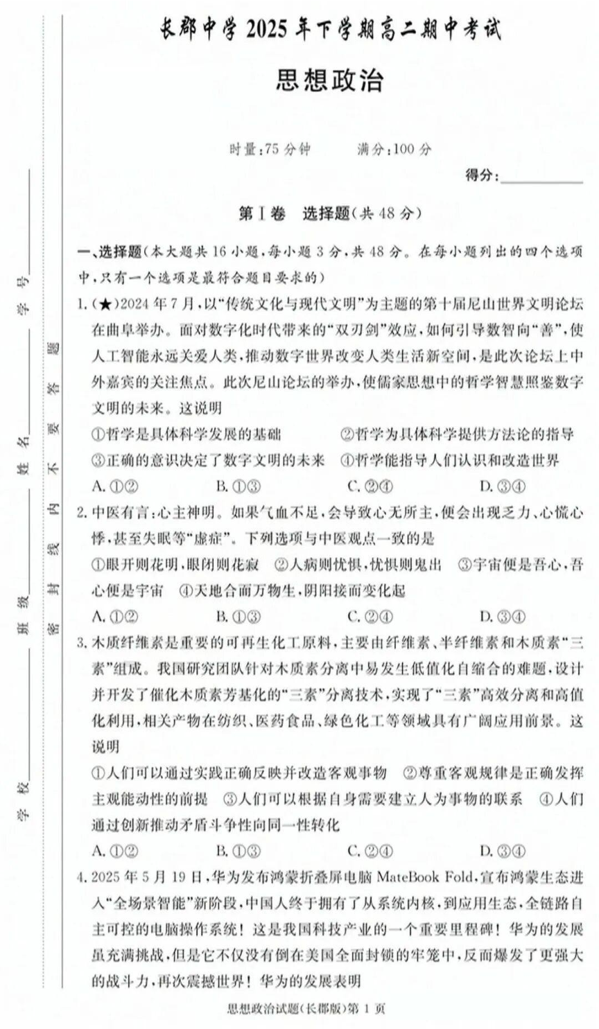 湖南省长沙市长郡中学2025年下学期高二11月期中考试 政治试题(含答案).pdf