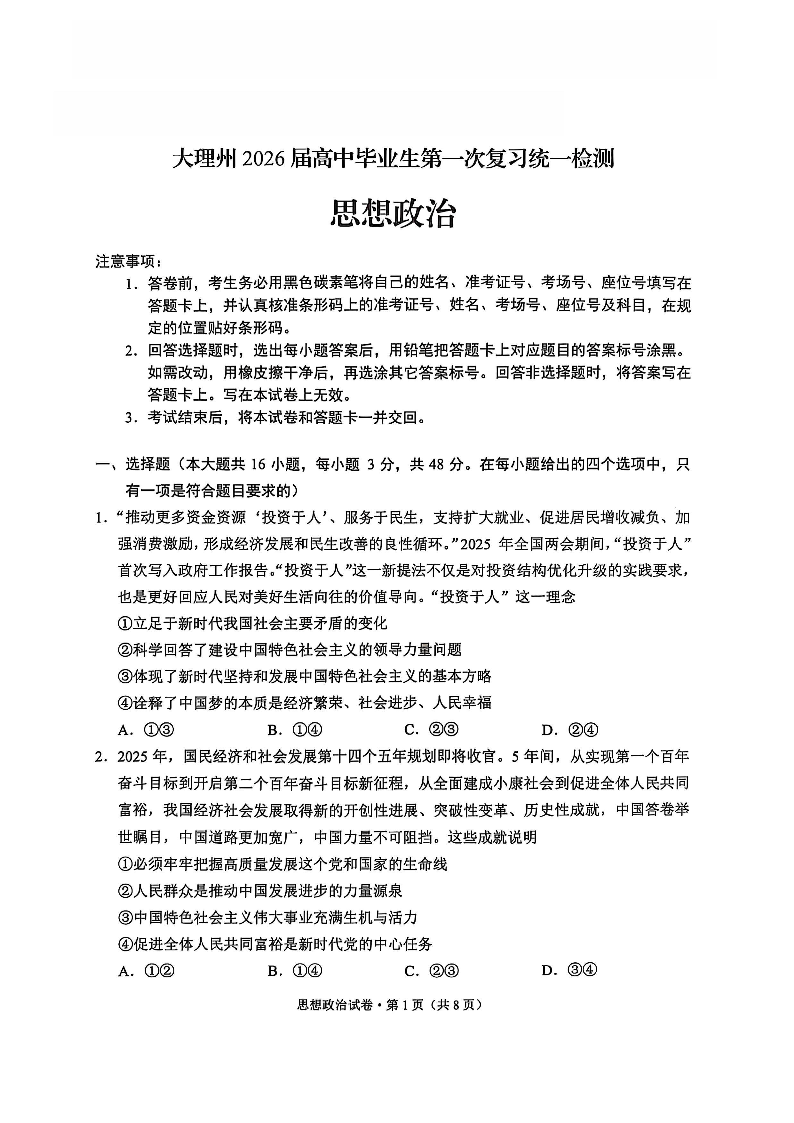 大理州2026届高中毕业生第一次复习统一检测 政治.pdf