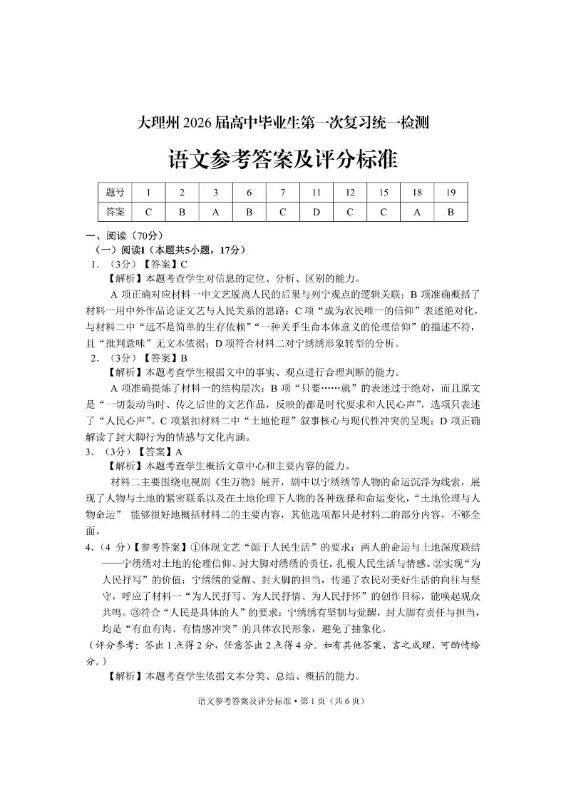 大理州2026届高中毕业生第一次复习统一检测 语文答案.pdf