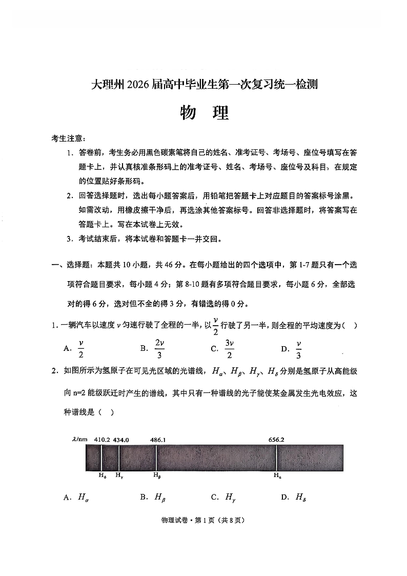 大理州2026届高中毕业生第一次复习统一检测 物理.pdf
