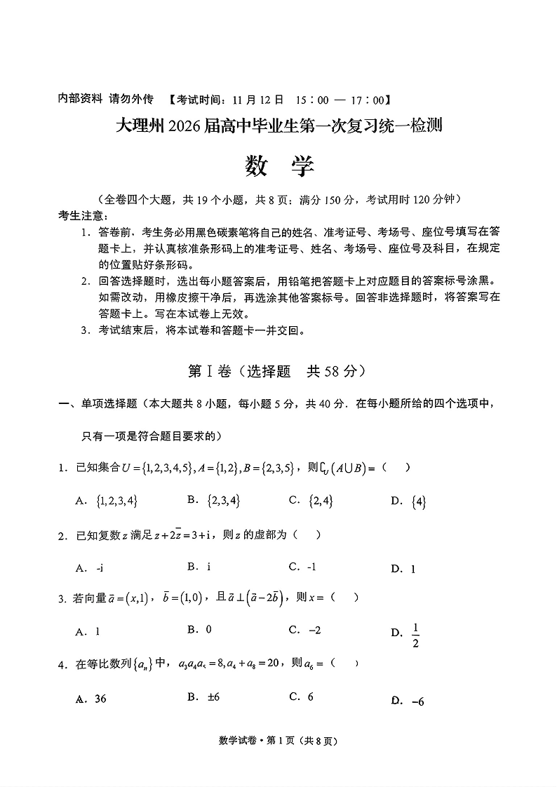 大理州2026届高中毕业生第一次复习统一检测 数学.pdf