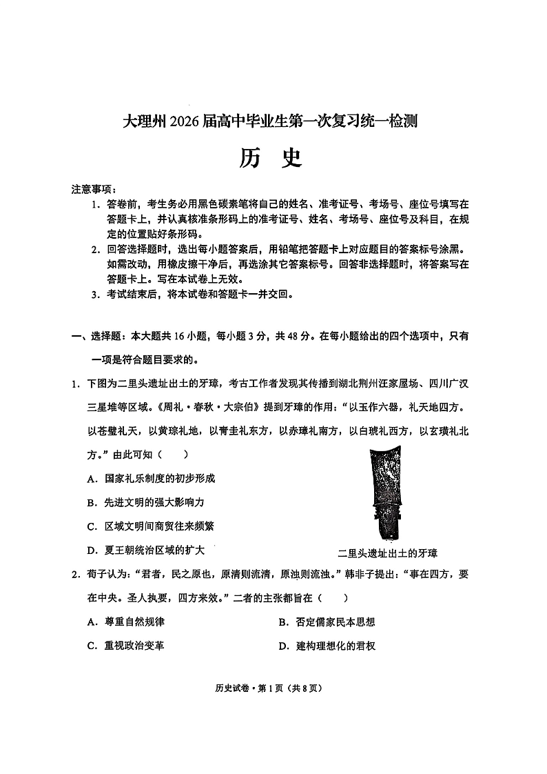 大理州2026届高中毕业生第一次复习统一检测 历史.pdf
