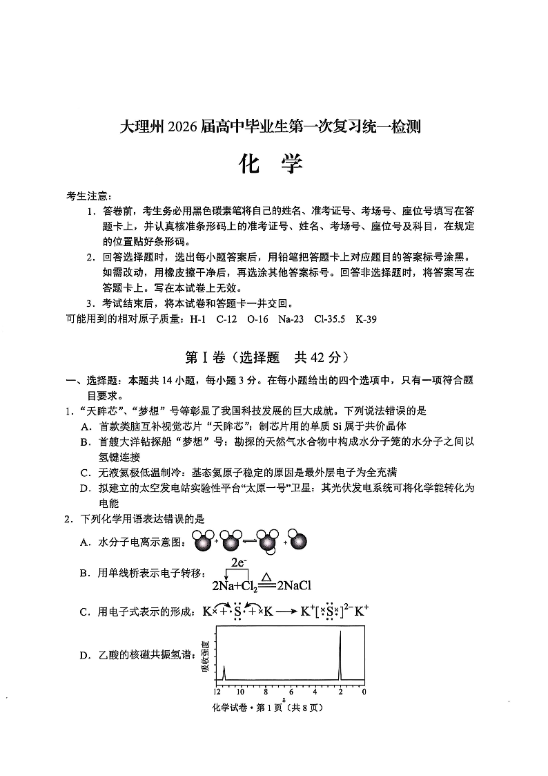 大理州2026届高中毕业生第一次复习统一检测 化学.pdf