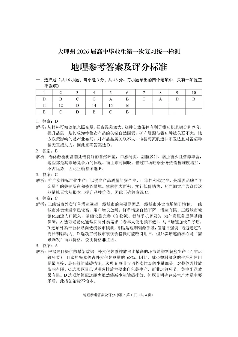 大理州2026届高中毕业生第一次复习统一检测 地理答案.pdf