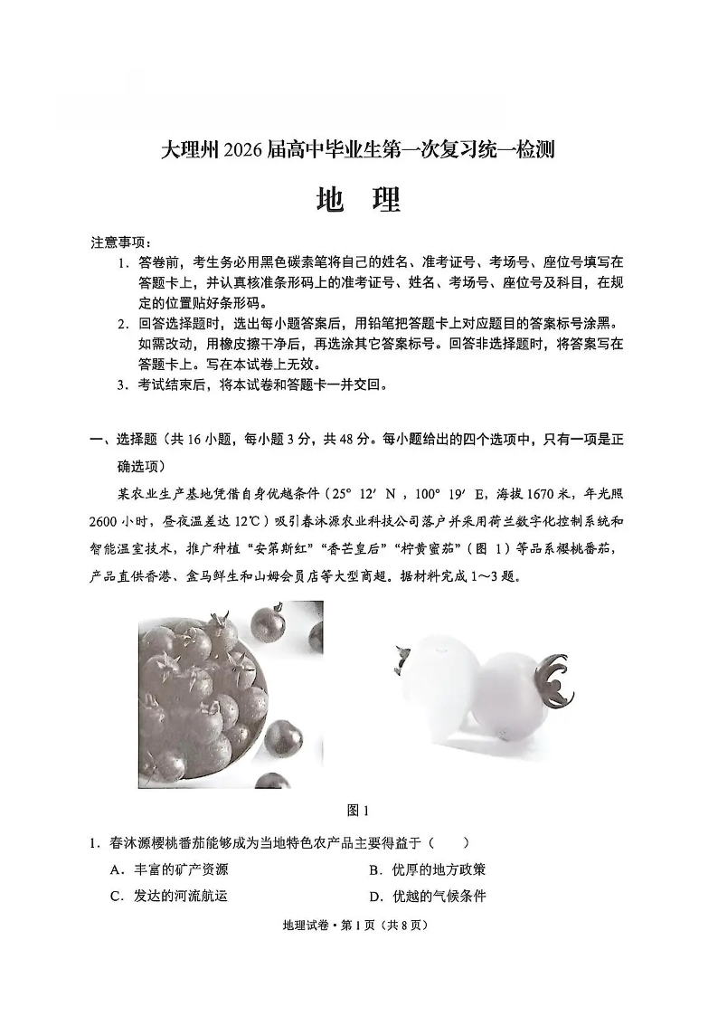 大理州2026届高中毕业生第一次复习统一检测 地理.pdf