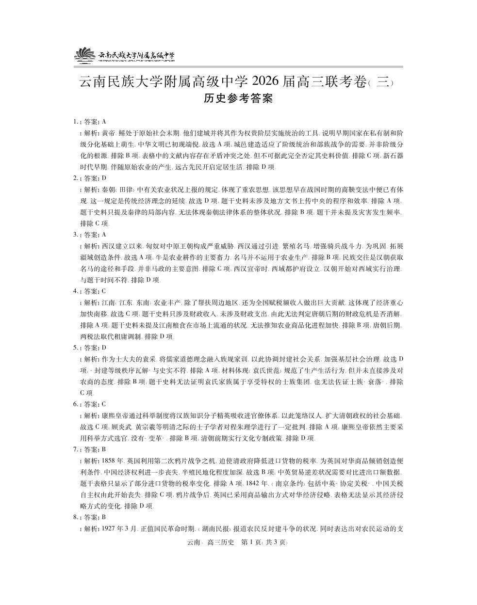 云南民族大学附属高级中学2026届高三联考卷(三)历史答案.pdf