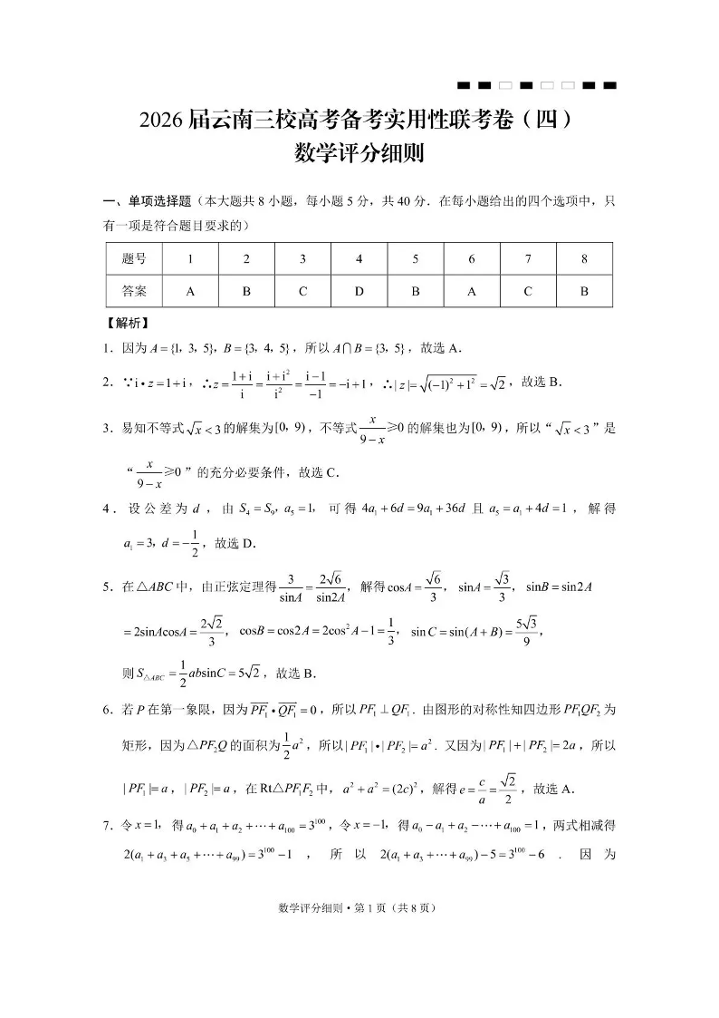2026届云南三校高考备考实用性联考卷(四)数学答案.pdf
