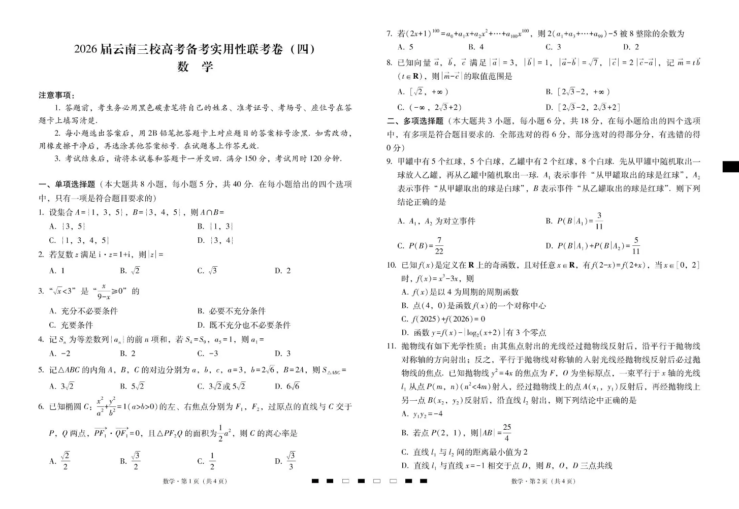 2026届云南三校高考备考实用性联考卷(四)数学.pdf