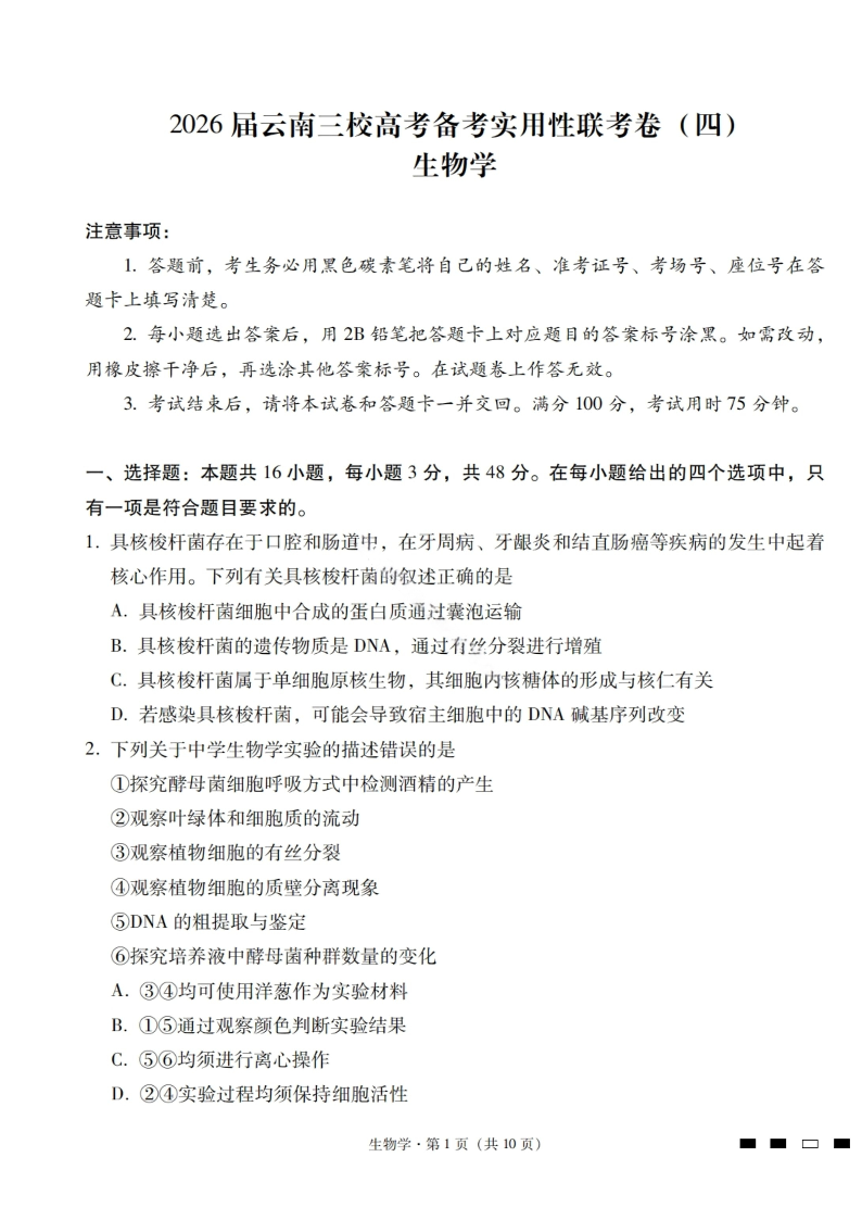 2026届云南三校高考备考实用性联考卷(四)生物.pdf