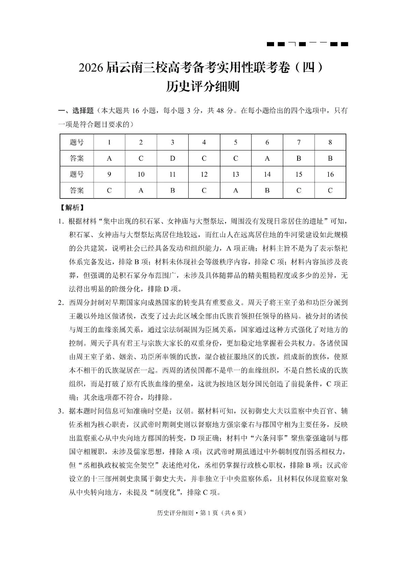 2026届云南三校高考备考实用性联考卷(四)历史答案.pdf