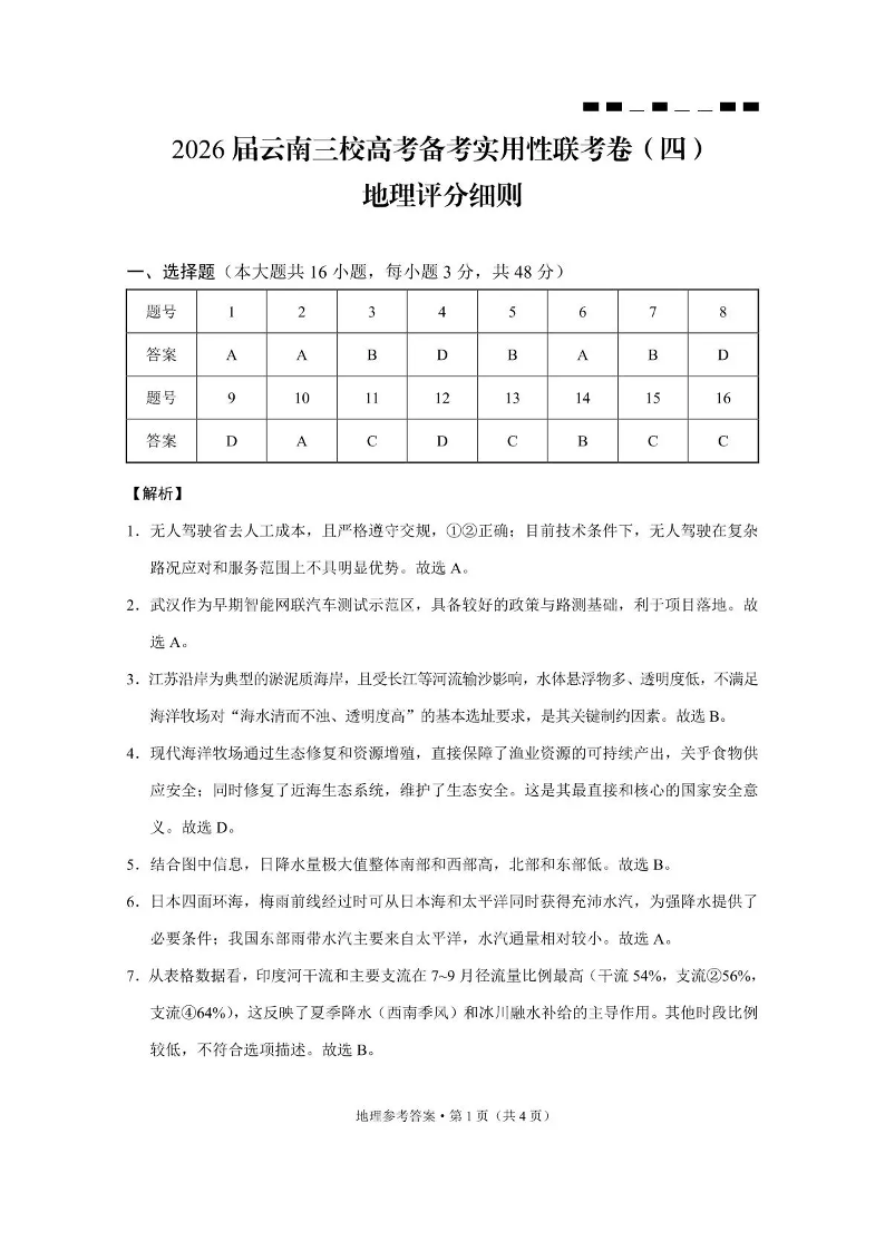 2026届云南三校高考备考实用性联考卷(四)地理答案.pdf