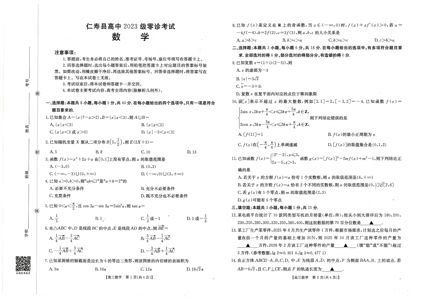 四川省仁寿县高中2023级零诊考试 数学.pdf