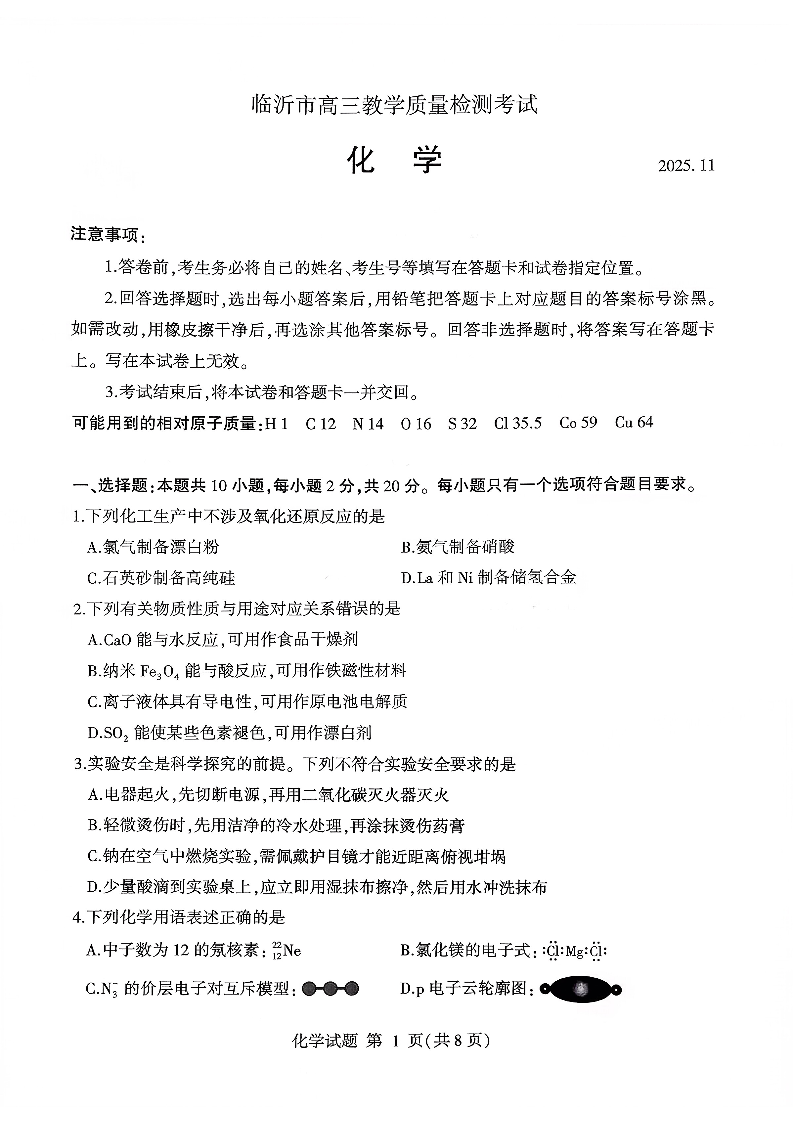 临沂市高三教学质量检测考试 化学.pdf