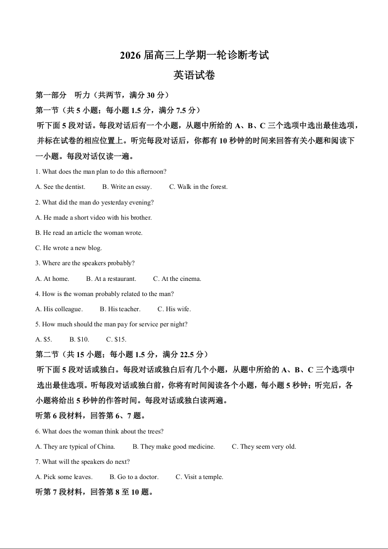 江西省宜春中学2026届高三上学期一轮诊断考试 英语试题(含答案).docx