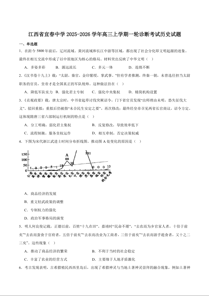 江西省宜春中学2026届高三上学期一轮诊断考试 历史试题(含答案).docx