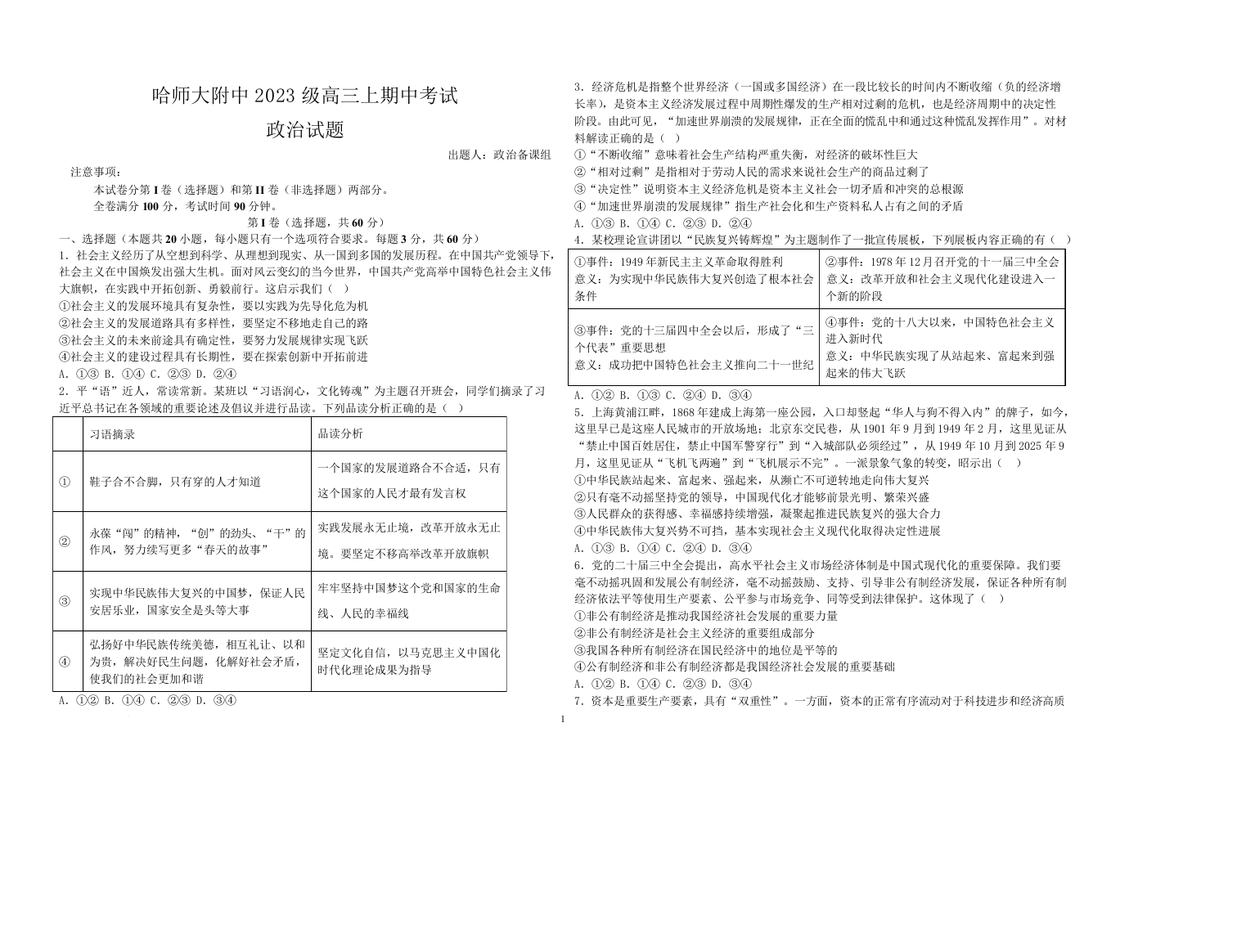 黑龙江省哈尔滨师范大学附属中学2026届高三上学期11月期中考试 政治.docx