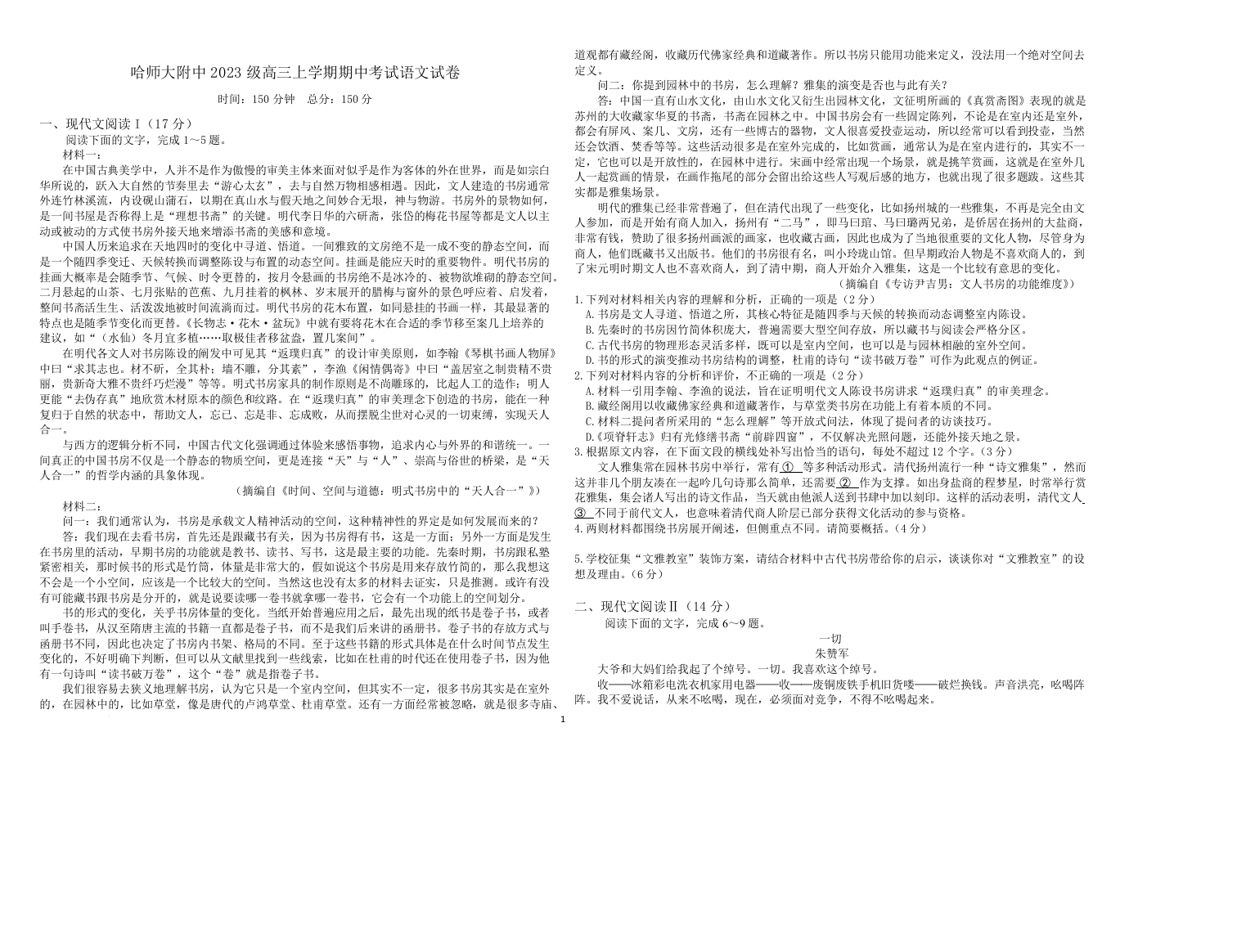 黑龙江省哈尔滨师范大学附属中学2026届高三上学期11月期中考试 语文.docx
