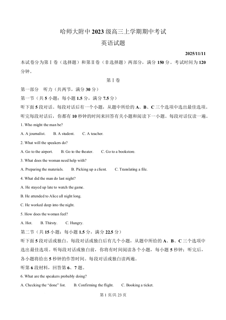 黑龙江省哈尔滨师范大学附属中学2026届高三上学期11月期中考试 英语答案.docx