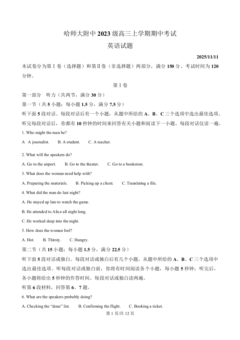 黑龙江省哈尔滨师范大学附属中学2026届高三上学期11月期中考试 英语.docx