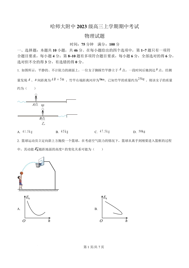 黑龙江省哈尔滨师范大学附属中学2026届高三上学期11月期中考试 物理.docx
