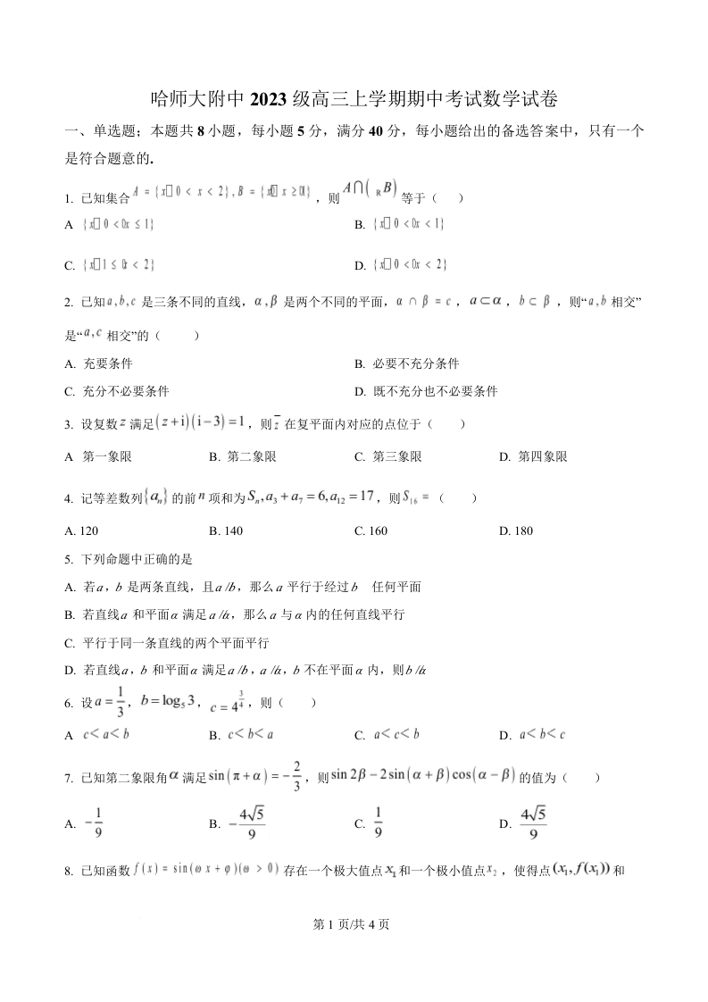 黑龙江省哈尔滨师范大学附属中学2026届高三上学期11月期中考试 数学.docx