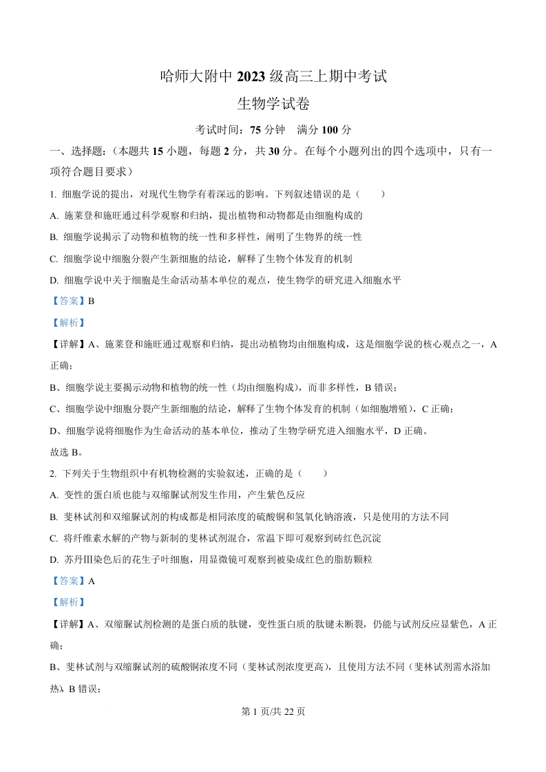 黑龙江省哈尔滨师范大学附属中学2026届高三上学期11月期中考试 生物答案.docx