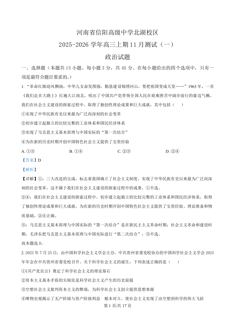 河南省信阳高级中学北湖校区2025-2026学年高三上期11月测试(一)政治答案.docx
