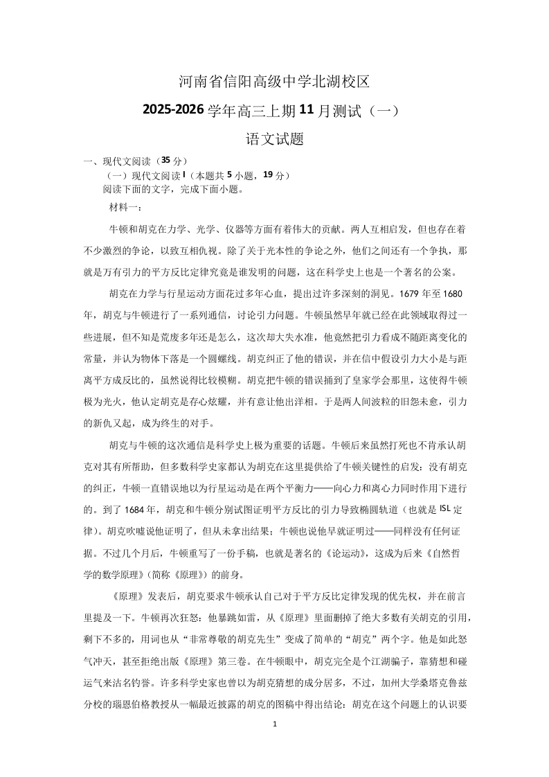 河南省信阳高级中学北湖校区2025-2026学年高三上期11月测试(一)语文.docx