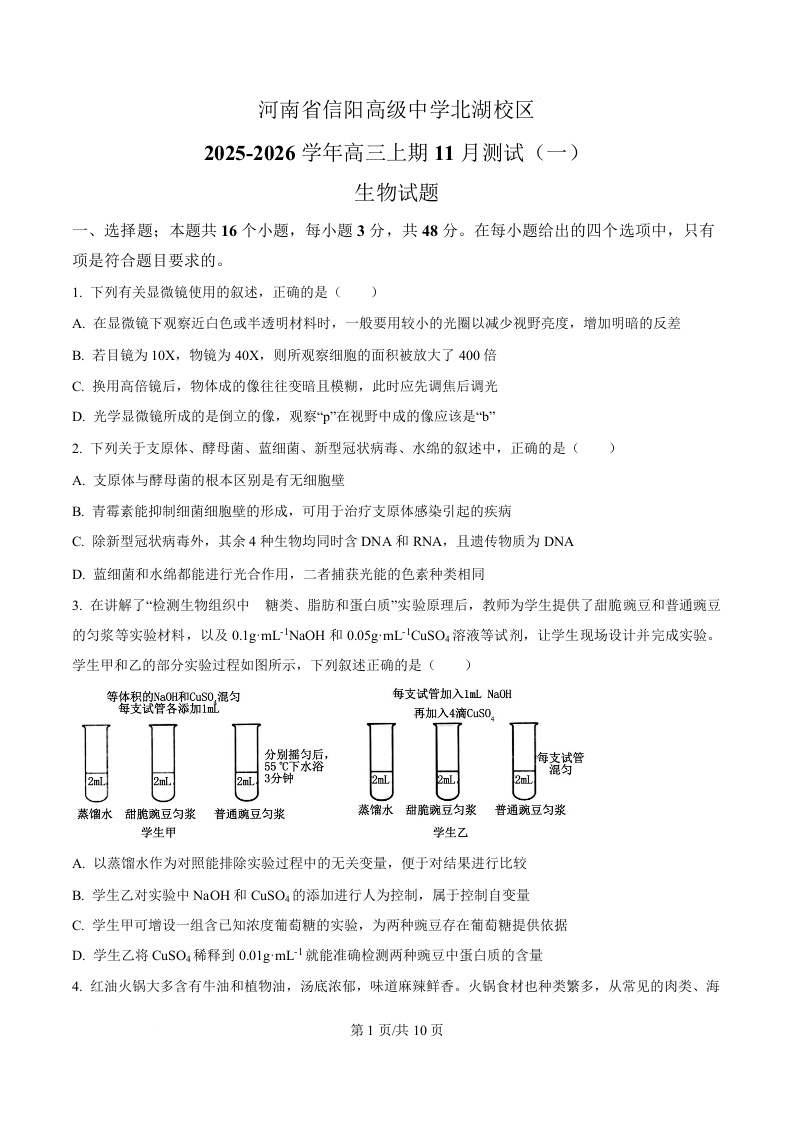 河南省信阳高级中学北湖校区2025-2026学年高三上期11月测试(一)生物.docx